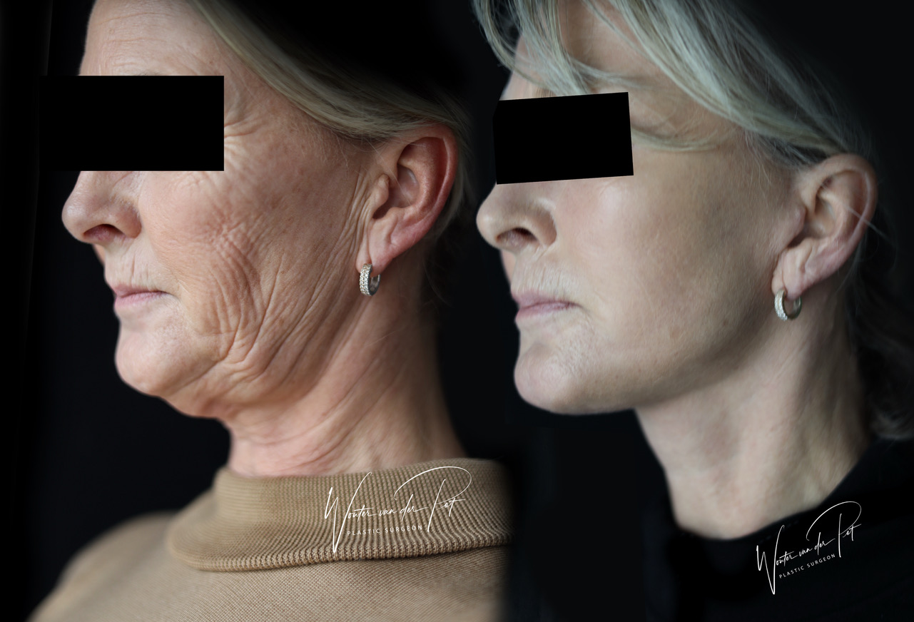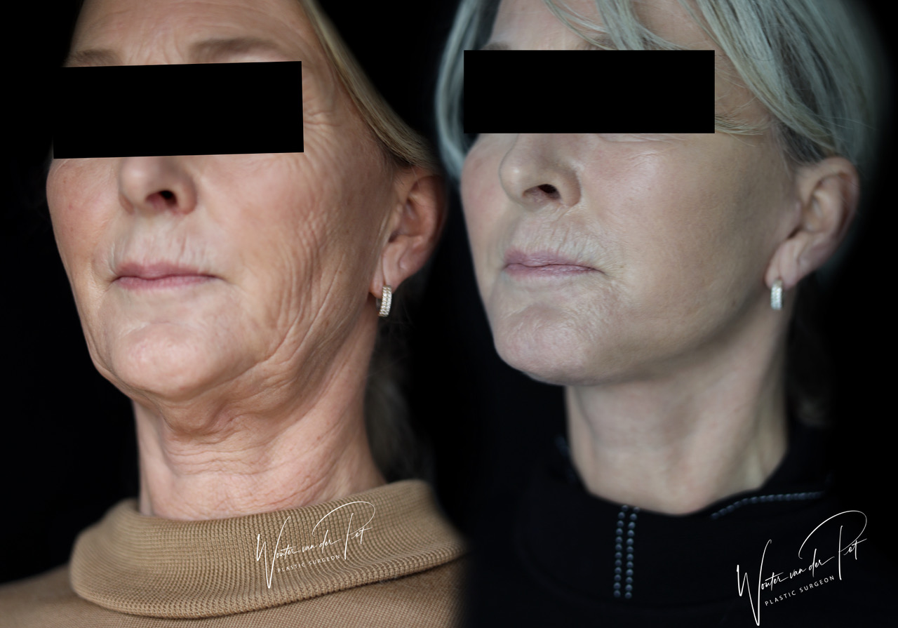 Veroudering van het gezicht bestaat vrijwel nooit uit één enkel probleem. Het is geen kwestie van alleen wat rimpels of een beetje huidoverschot. In de loop der jaren zakken de weke delen van het gezicht als geheel naar beneden. Daardoor verliest het gezicht zijn natuurlijke contouren, met name langs de kaaklijn en in de hals. Het resultaat is vaak een vermoeide, zwaardere of strengere uitstraling, terwijl iemand zich van binnen nog vitaal voelt.Het meest natuurlijke en duurzame resultaat bereik je dan ook niet door losse symptomen te behandelen, maar door deze algehele verzakking bij de oorzaak aan te pakken.