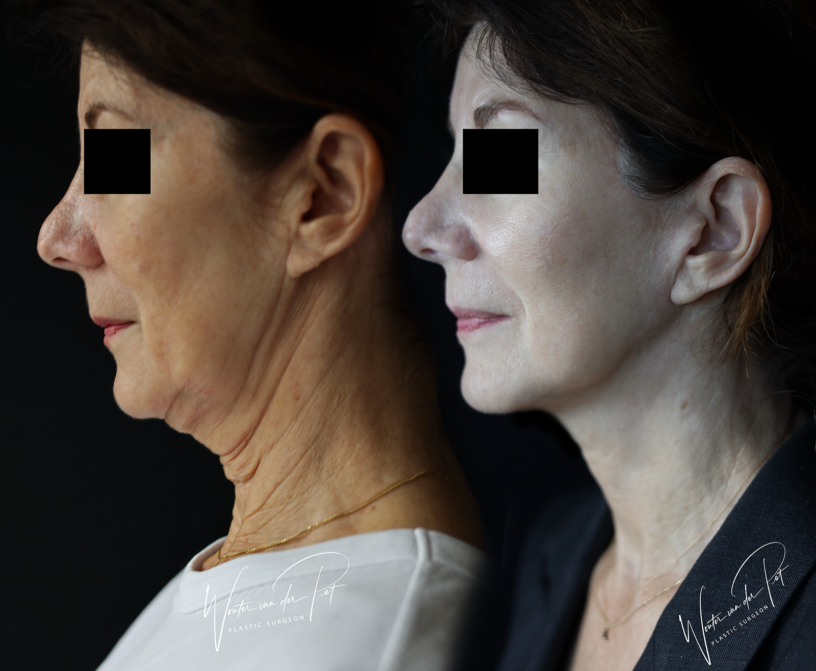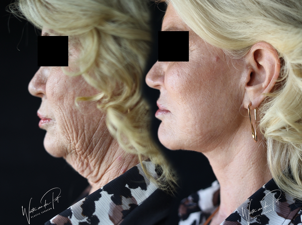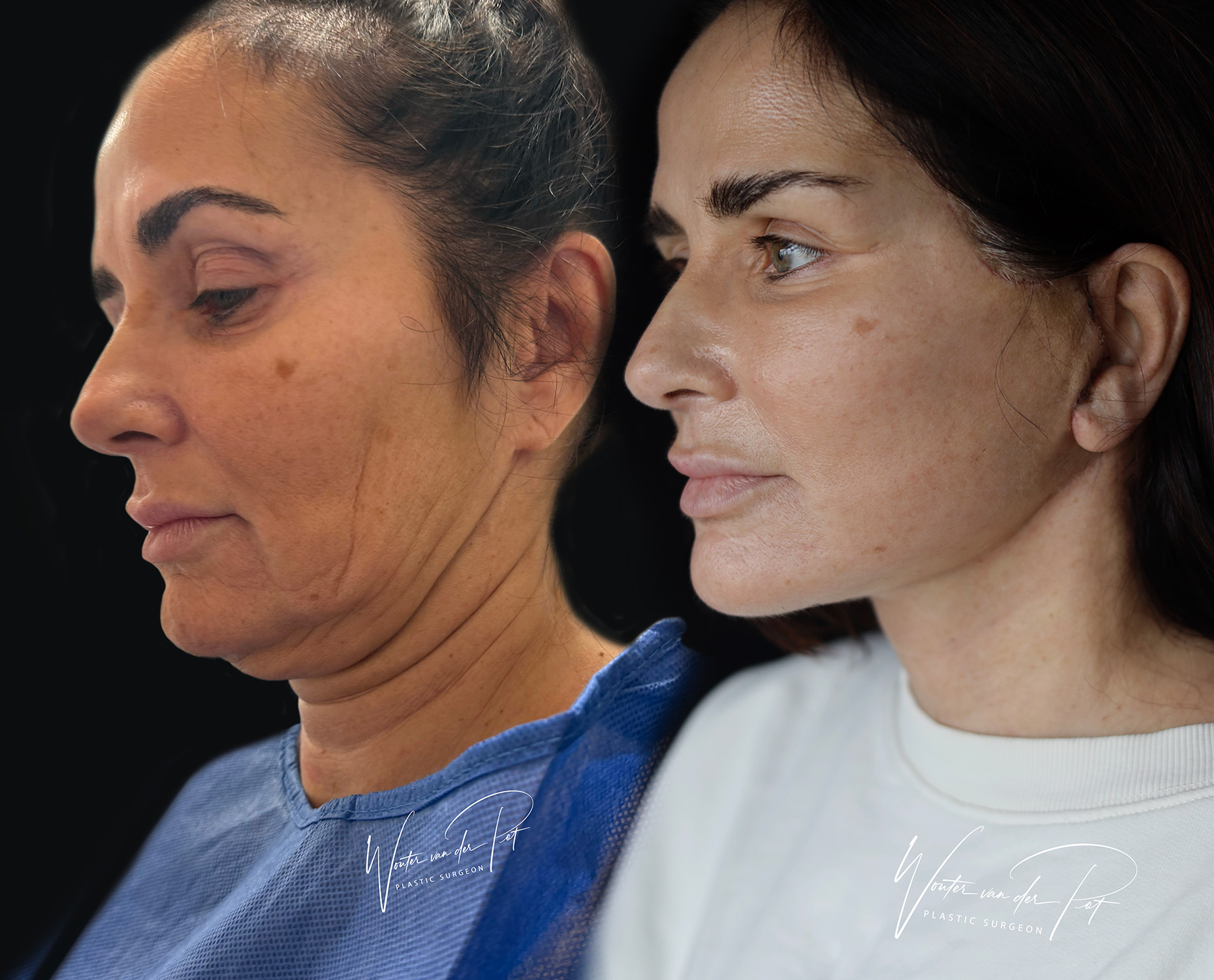 Veroudering van het gezicht bestaat vrijwel nooit uit één enkel probleem. Het is geen kwestie van alleen wat rimpels of een beetje huidoverschot. In de loop der jaren zakken de weke delen van het gezicht als geheel naar beneden. Daardoor verliest het gezicht zijn natuurlijke contouren, met name langs de kaaklijn en in de hals. Het resultaat is vaak een vermoeide, zwaardere of strengere uitstraling, terwijl iemand zich van binnen nog vitaal voelt.Het meest natuurlijke en duurzame resultaat bereik je dan ook niet door losse symptomen te behandelen, maar door deze algehele verzakking bij de oorzaak aan te pakken.